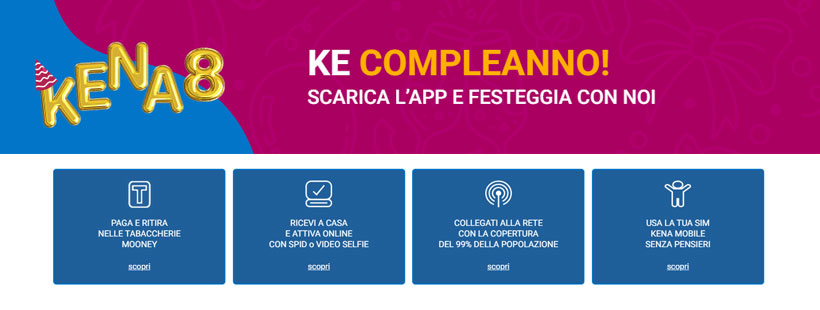 Kena MobileI piani tariffari di Kena Mobile sono senza costi nascosti e non vincolanti, sei libero di interrompere la sottoscrizione quando vuoi! Puoi gestire la tua linea direttamente dal tuo smartphone scaricando la nuova app di Kena Mobile e hai a disposizione una serie di servizi come: “Lo sai di Kena”, grazie al quale non perderai più una chiamata, la segreteria telefonica gratuita e gli SMS bancari, con i quali verrai avvisato ogni volta che viene effettuata una transazione sul tuo conto corrente. Kena Mobile ti offre una serie di pacchetti voce + navigazione, che si adattano alle esigenze più svariate, con piani tariffari mensili ricaricabili. Inoltre, puoi richiedere gratuitamente di portare il tuo vecchio numero quando passi a Kena, così da non doverlo cambiare e affrontare lo stress di comunicare un nuovo numero di telefono a tutti i tuoi contatti. Infine, Kena offre anche dei piani tariffari base solo dati per SMS e Giga di navigazione, utili anche quando hai necessità di utilizzare dati extra oltre a quelli contenuti nel piano tariffario scelto, oppure per navigare dal tuo tablet o Ipad. E se viaggi spesso per lavoro, oppure stai per andare in vacanza, Kena Mobile offre piani tariffari anche per l’estero, con traffico dati e minuti per chiamare casa.