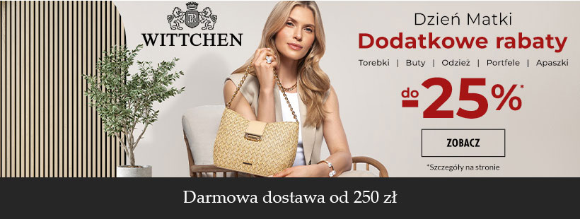 Sklep Wittchen jest jedną z najbardziej prestiżowych marek produkujących elegancką galanterię skórzaną. Firma od lat cieszy się popularnością wśród klientów. Artykuły tej marki są cenione za wysoką staranność wykonania, nowoczesną formę oraz wzory odpowiadające najświeższym trendom. Stacjonarne sklepy Wittchen są doskonale znane mieszkańcom wielu miast, funkcjonuje również platforma online, na której zyskujesz dostęp do szerokiego wyboru skórzanych akcesoriów.Pewnością zainteresują was stałe kolekcje jakie możecie zakupić w WITTCHEN. Są to między innymxi: Italy | Verona | Florence | Snake | Croco | City Leather | Arizona | Da | Vinci | Signature. Serca klientów podbija również ręcznie robione skórzane obuwie, które właścicielowi może służyć przez długie lata. Do tego dochodzą również skórzane paski, czapki, rękawiczki oraz kurtki i kożuchy w najmodniejszych fasonach. Wszystkie te produkty możecie znaleźć w sklepach stacjonarnych, jeśli jednak chcecie zaoszczędzić czas, a przy okazji wykorzystać unikalne rabaty wybierzcie zakupy online w internetowym sklepie WITTCHEN. Gdy myślimy zakupie o eleganckiej galanterii skórzanej zazwyczaj musimy liczyć się z większym wydatkiem. Jednak od czego są najróżniejsze promocje? Organizują je nawet tak ekskluzywne sklepy jak WITTCHEN, dzięki czemu każdy może pozwolić sobie na ich produkty.Na stronie internetowej sklepu znajdziecie osobną zakładkę „Outlet”, gdzie umieszczane są końcówki kolekcji. Wszystkie produkty objęte są dużymi rabatami, sięgającymi nawet 70%. Równie ciekawie prezentują się sezonowe promocje organizowane przez sklep. Trzeba przyznać, że WITTCHEN bardzo lubi promocje ponieważ o każdej porze roku na stronach sklepu znajdziemy przecenione produkty